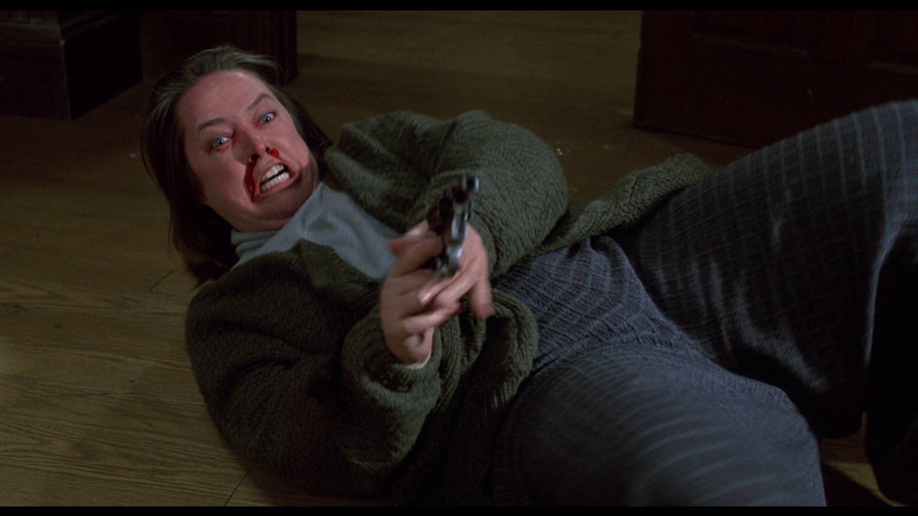 Probablemente lo que mas queda quemado en la memoria óptica de la gente en cuanto a lo que es Misery, debe ser cierta escena donde Annie utiliza un martillo transformandose en Triple H unos segundos, no voy a especificar que hace y dejar que la imagen de abajo hable sola, pero esa escena, habiendo visto películas con mucho mas gore que esta, se sigue viendo muy terrorífica gracias a su gran uso de la lógica del "menos es mas".